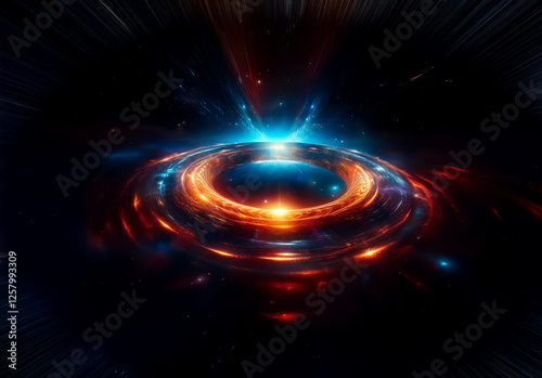 Abstract cosmic burst of energy. A vibrant ring of light explodes in space with blue and orange hues, creating a dynamic and celestial spectacle.