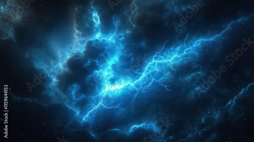 Abstract cosmic nebula with vibrant blue lightning streaks across dark clouds and stars.