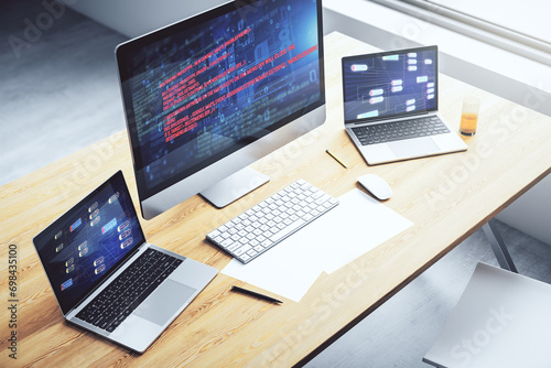 Abstract creative coding concept on modern laptop screen. 3D Rendering