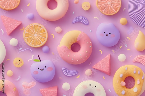 Abstract cute food icons like floating donuts, wiggly noodles, and smiling fruit in dreamy minimal style