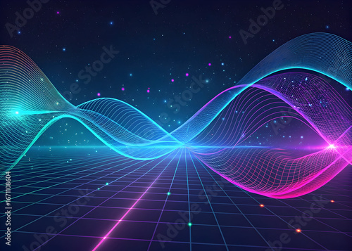 Abstract Cyberpunk Neon Wave Holographic Reflections Digital Art Blue Pink Purple Grid Lines Glowing Particles Futuristic Background