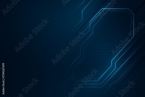 Abstract dark blue background with glowing lines forming a geometric shape on the right side.