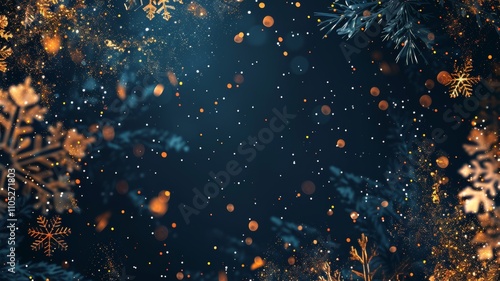 Abstract dark blue background with snowflakes and golden glitter for a Christmas or New Year greeting card or poster design. Space for text in the center.