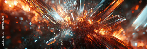 Abstract depiction of an explosive burst with fiery and crystalline elements