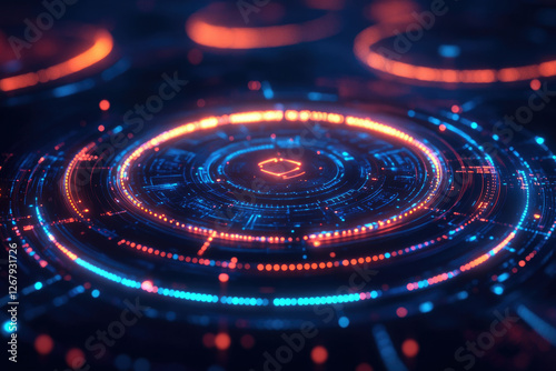 Abstract digital art depicting a futuristic circular interface with glowing neon lights in blue and orange.