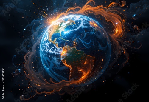 Abstract digital art depicting Earth engulfed in flames and energy.