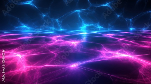 Abstract digital art featuring vibrant blue and pink electric patterns on a dark background.