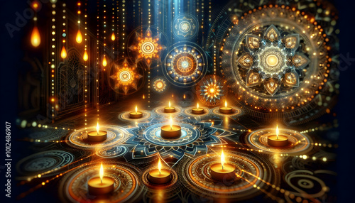 Abstract Digital Art of Glowing Diwali Lanterns and Intricate Patterns Representing Cultural Gatherings for Modern and Traditional Celebrations in Photo Stock Concept