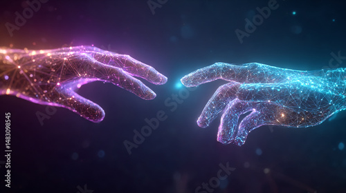 Abstract digital art two hands reaching connection network technology futuristic glow purple blue light elegant