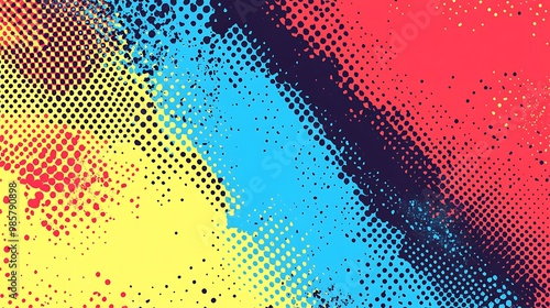 Abstract digital art with a blue, yellow, red, and black color scheme and a halftone pattern