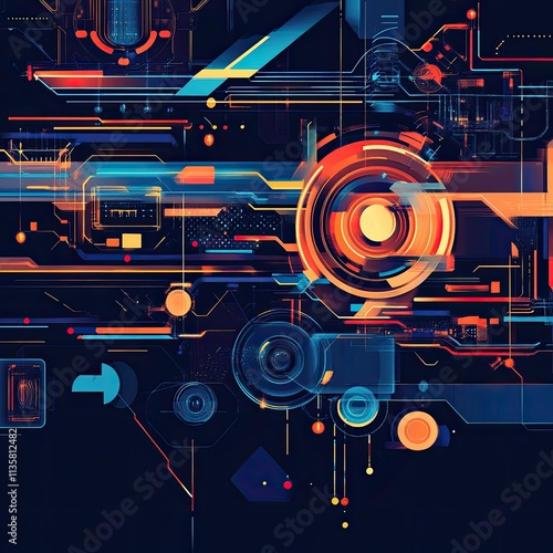 Abstract digital art with glowing lines, circles, and geometric shapes.