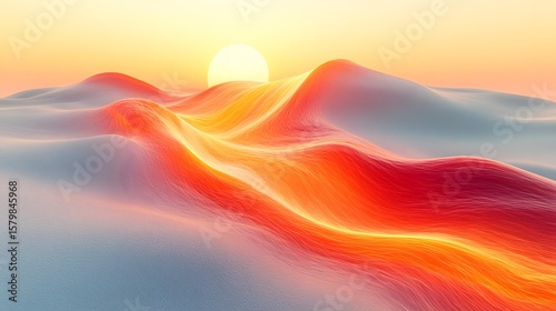 Abstract digital artwork depicting a vibrant sunrise or sunset over stylized, rolling waves or dunes, rendered in glowing reds, oranges, and subtle blues.