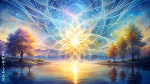Abstract digital artwork of a glowing flower pattern over a serene lake landscape