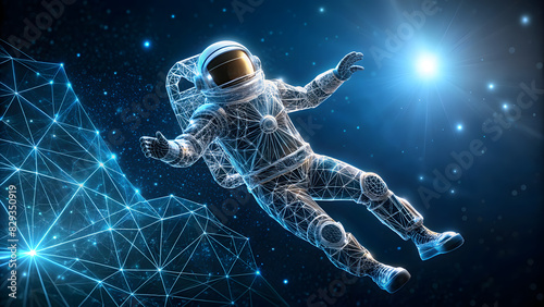 Abstract Digital Astronaut Floating in Space Against Cosmic Black Background. Perfect for: World Space Week, International Day of Human Space Flight, National Astronaut Day.