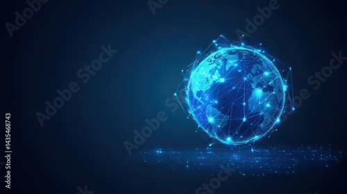 Abstract digital background featuring a glowing Earth with interconnected nodes, representing the internet, blockchain technology, and global data exchange, high-tech business and communication theme.