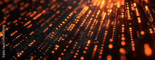 Abstract digital background with glowing blue and orange futuristic shapes resembling computer keyboard keys on a dark black background. Big data technology concept.