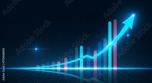 Abstract digital bar chart with glowing blue arrow pointing upwards showing financial growth and positive market trend with dark background PNG cutout transparent background isolate