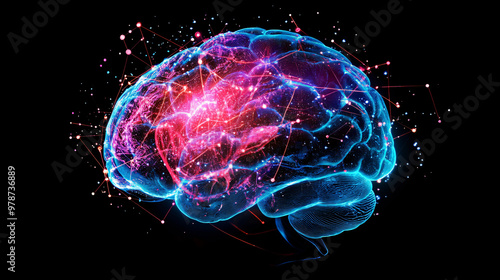 abstract digital brain with neon lights and glowing connections - blue and red - dark background - ai - technology - future - innovation - neuroscience