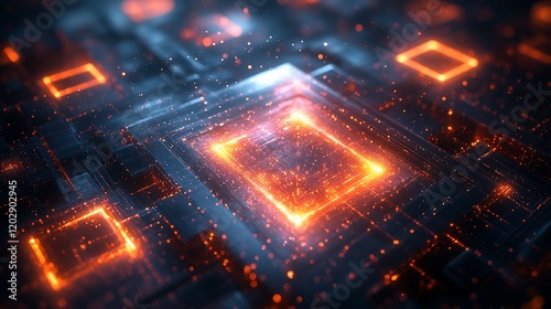 Abstract Digital Circuitry: Glowing Neon Squares and Data Streams