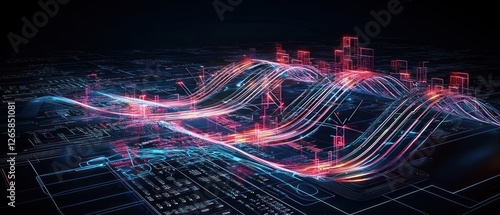Abstract Digital Cityscape with Glowing Waves and Bright Lights