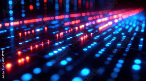 Abstract Digital Data Flow with Bright Red and Blue Lights on a Dark Background, Representing Modern Technology, Networking Concepts, and Futuristic Visualization