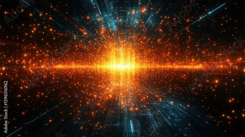 Abstract digital explosion, space warp, dark background, orange/blue light