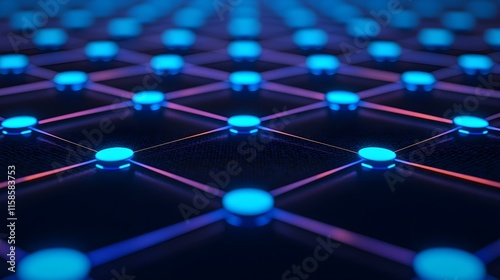 Abstract Digital Grid with Glowing Blue Circles and Neon Highlighted Lines on Dark Background