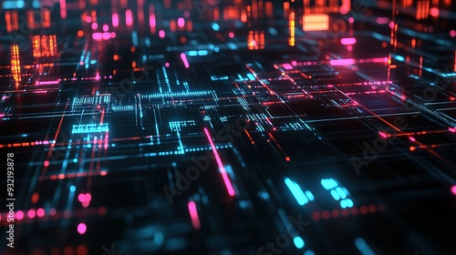 Abstract digital grid with vivid reflections and neon colors in a futuristic design