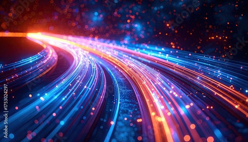 Abstract Digital Highway with Blurry Streaks of Blue and Orange Light Particles Floating in Dark Cosmic Background
