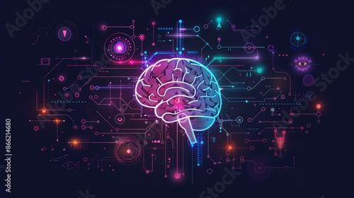 Abstract digital illustration of a brain on a circuit board with glowing neon lines.