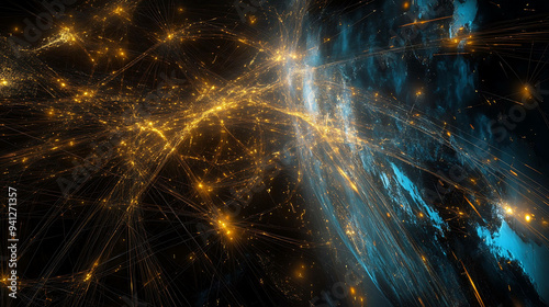 Abstract digital illustration of the earth with glowing lines connecting cities.