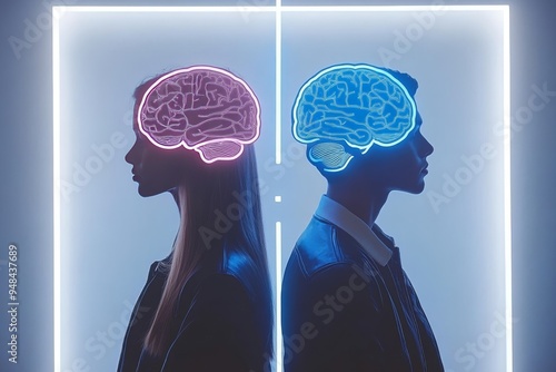Abstract digital illustration of two faces with glowing brains symbolizing the dynamic exchange of thoughts and ideas in a minimalist futuristic design