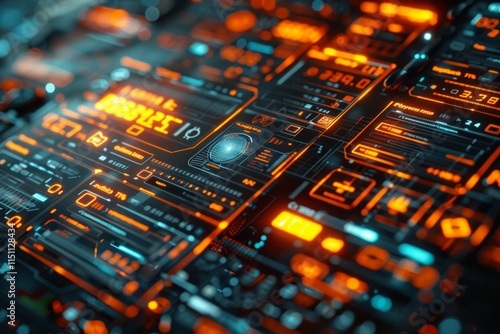 Abstract digital interface with orange and blue glowing elements. AI generative.
