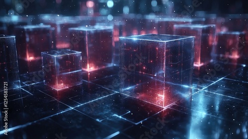 Abstract digital landscape featuring glowing cubes in a futuristic setting with a soft focus background