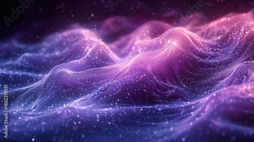 Abstract digital landscape of undulating, shimmering particles in vibrant purple and blue hues.
