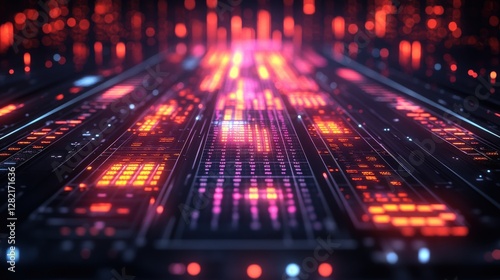 Abstract digital landscape with glowing neon patterns and lights creating a futuristic atmosphere