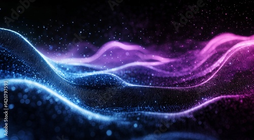 Abstract digital landscape with glowing particles. Fluid, wavy lines of vibrant blue and purple light. Glittering, detailed particles create a dynamic, futuristic effect