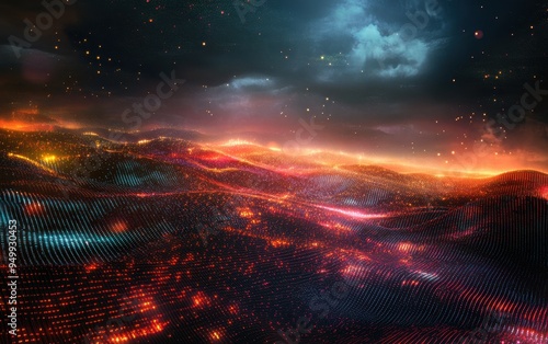 Abstract Digital Landscape with Red and Blue Lights at Night.