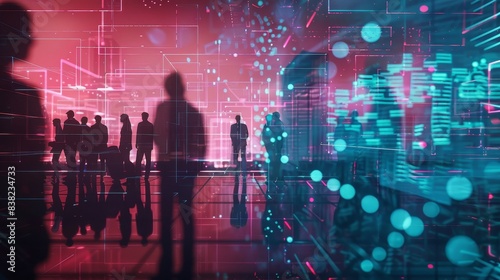 Abstract digital landscape with silhouettes, technology integration, and data visualization concepts in a futuristic environment.