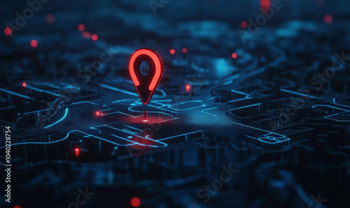 Abstract digital map with location pin and hologram red light icon on a blue background