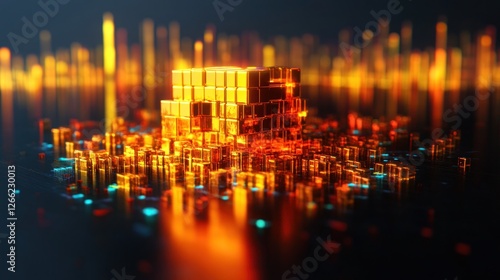 Abstract Digital Metropolis: Glowing Golden Cubes and Neon Lights