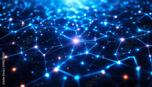 Abstract digital network illustration with glowing blue lines and interconnected points in dark space