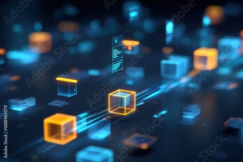 Abstract digital network of glowing cubes. Data streams and glowing UI elements. Complex interconnected system