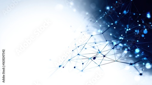 Abstract digital network with blue and white connections and glowing dots, representing technology and innovation