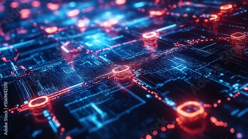 Abstract digital network with glowing lines and nodes in red and blue.