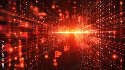 Abstract digital network with red light and geometric shapes in a dark space.