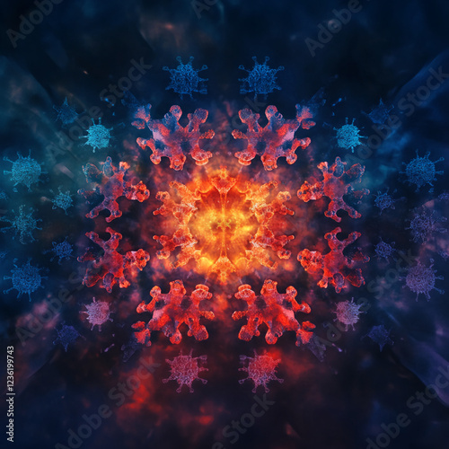 Abstract digital representation of red and blue virus-like cells in a symmetrical formation, symbolizing infection, disease, or microscopic research in science and biology.