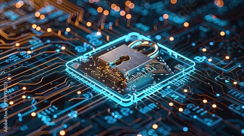 Abstract Digital Security Concept Lock Symbol Overlaid on a Circuit Board Background, Illustrating Advanced Data Protection and Cybersecurity
