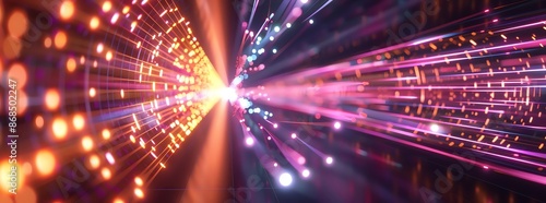 Abstract digital technology background with a glowing light burst, vibrant colors, and dynamic lines representing data flow and speed.