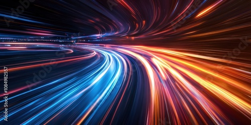 Abstract digital tunnel with blurred light streaks in blue, orange, and red.